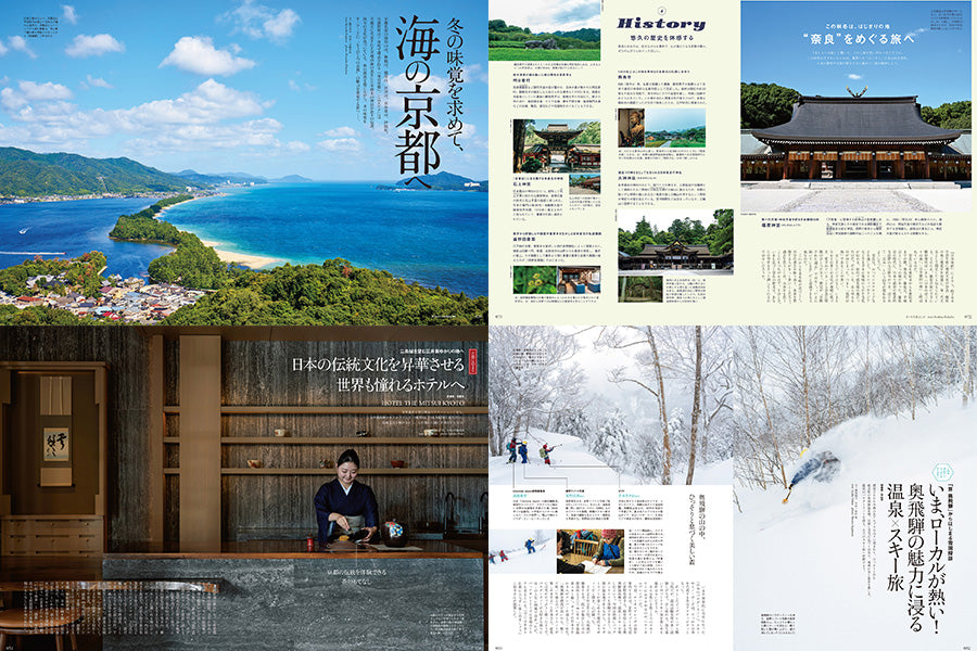 来年開催の寛永行幸四百年祭を先取り案内。さらに今号は海の京都をフィーチャー。洛中洛外の文化を堪能できるホテル&名宿も厳選収録。足を延ばして行きたい奈良や、第2特集「この冬行きたいローカル」も注目です。