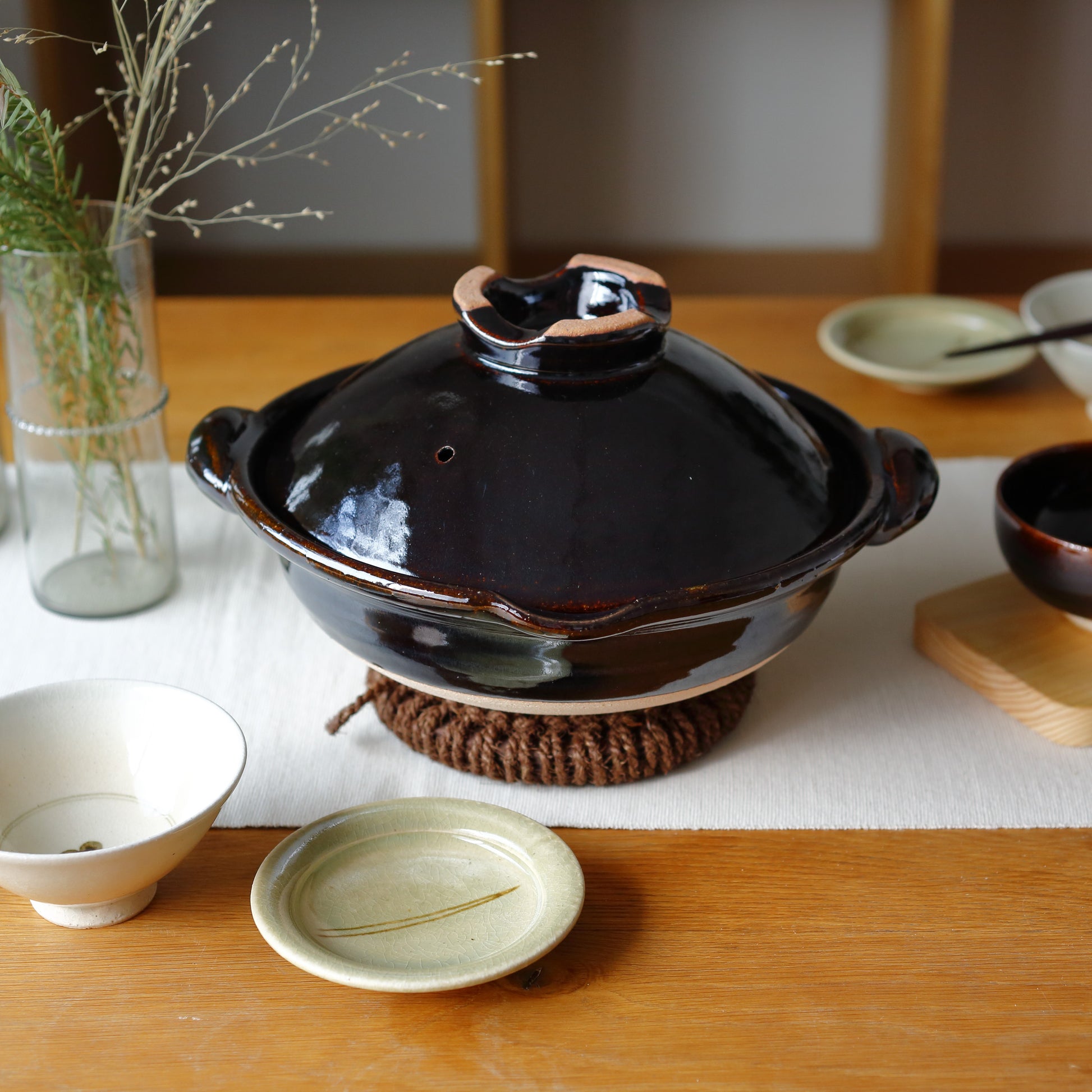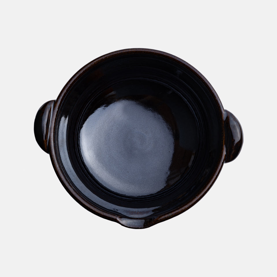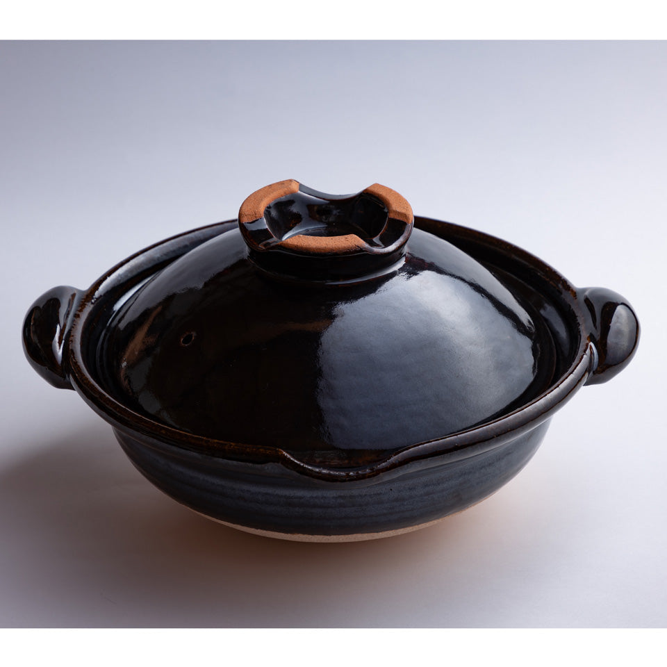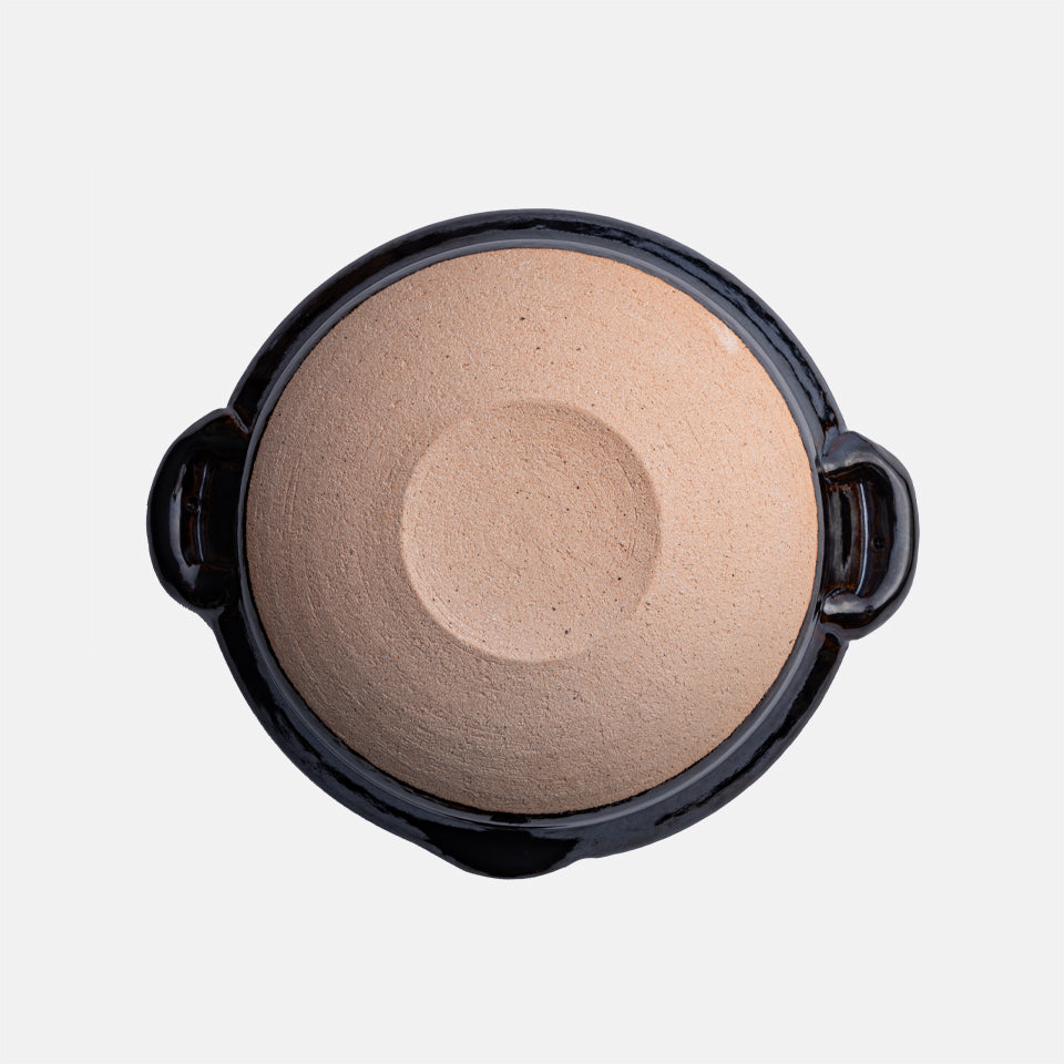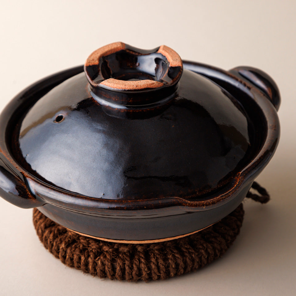 機械で作るかたちが均一な土鍋と違い、ひとつひとつゆがみや焼き色が違い、「一点もの」の土鍋ができあがります。 "食べるための器"として作られた圡楽の土鍋は美しく、食卓にもそのままうつわとして活躍します。料理が映える黒釉は、圡楽窯で独自に研究されたオリジナルです。