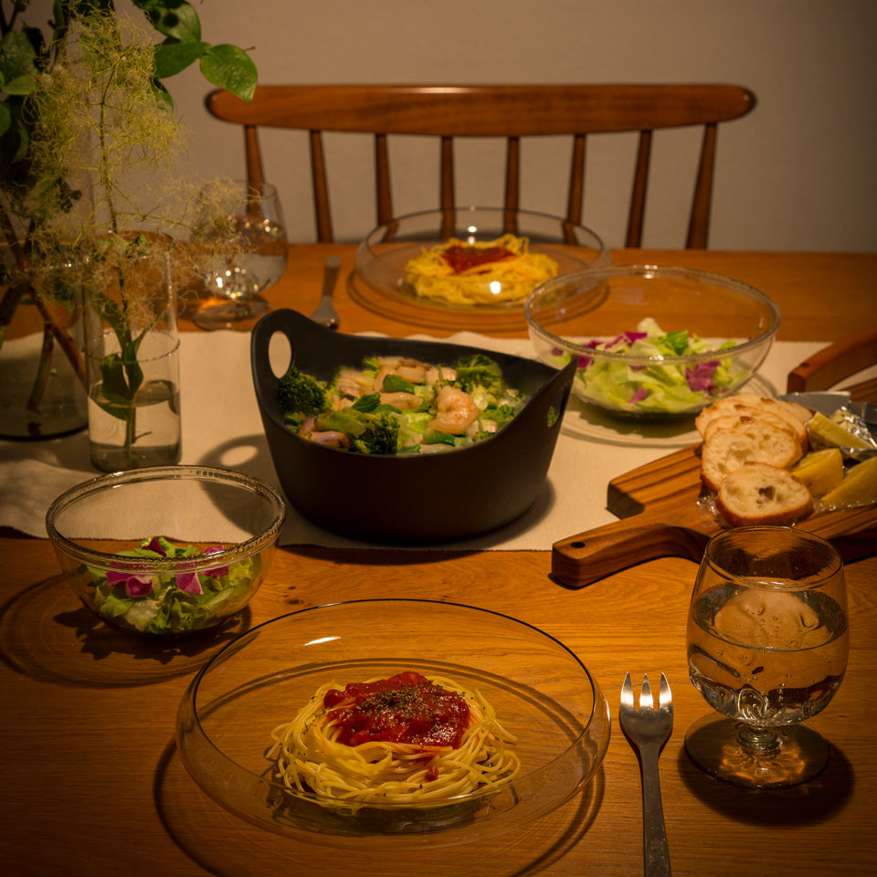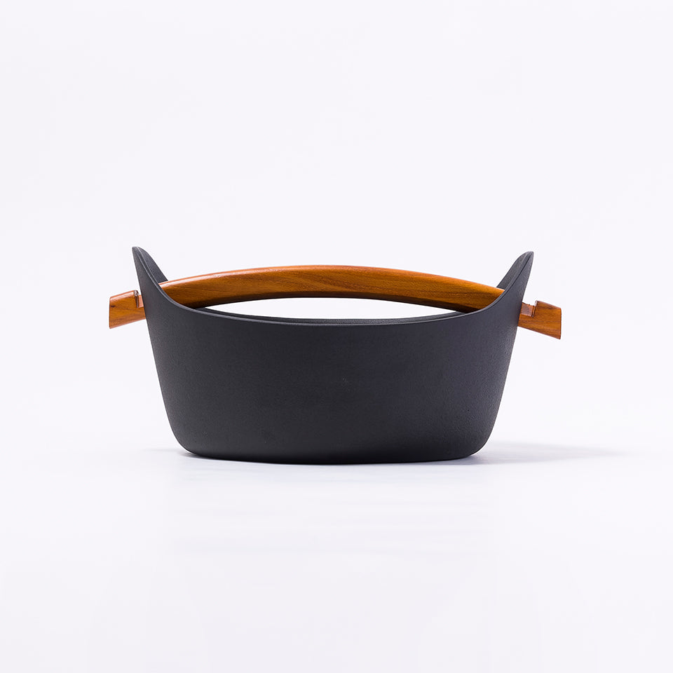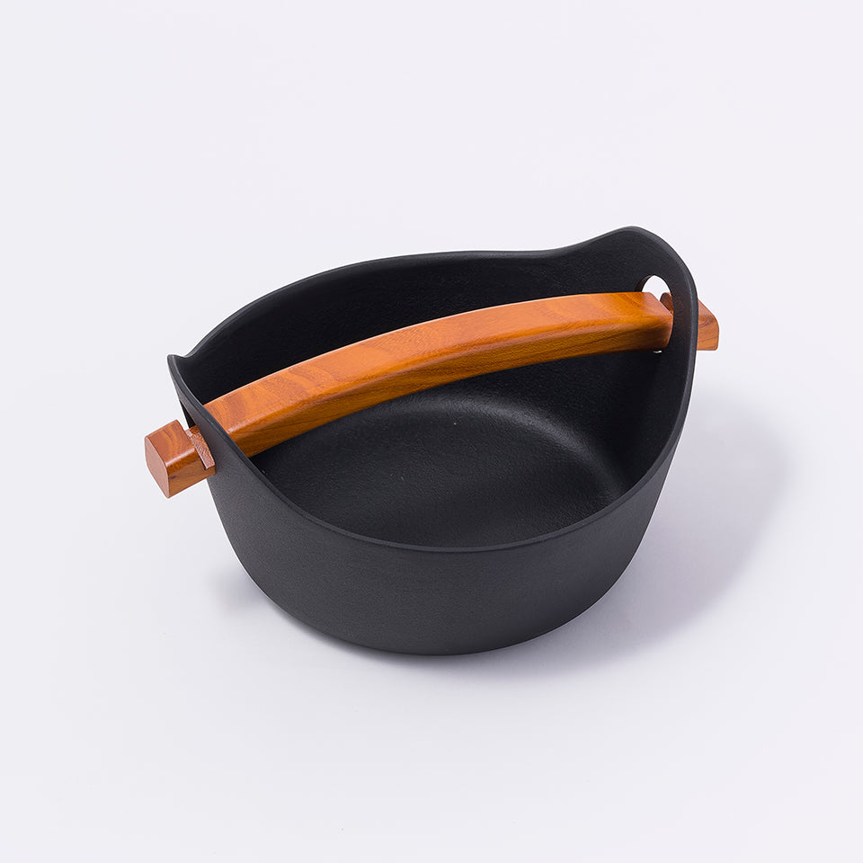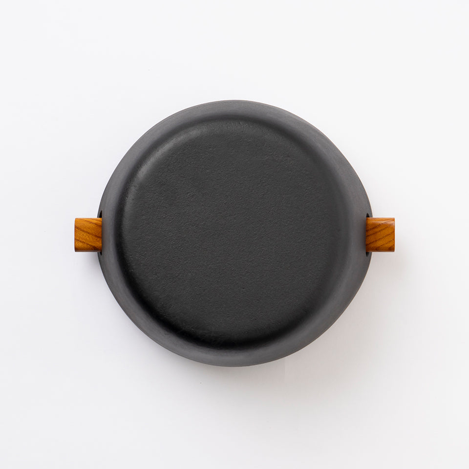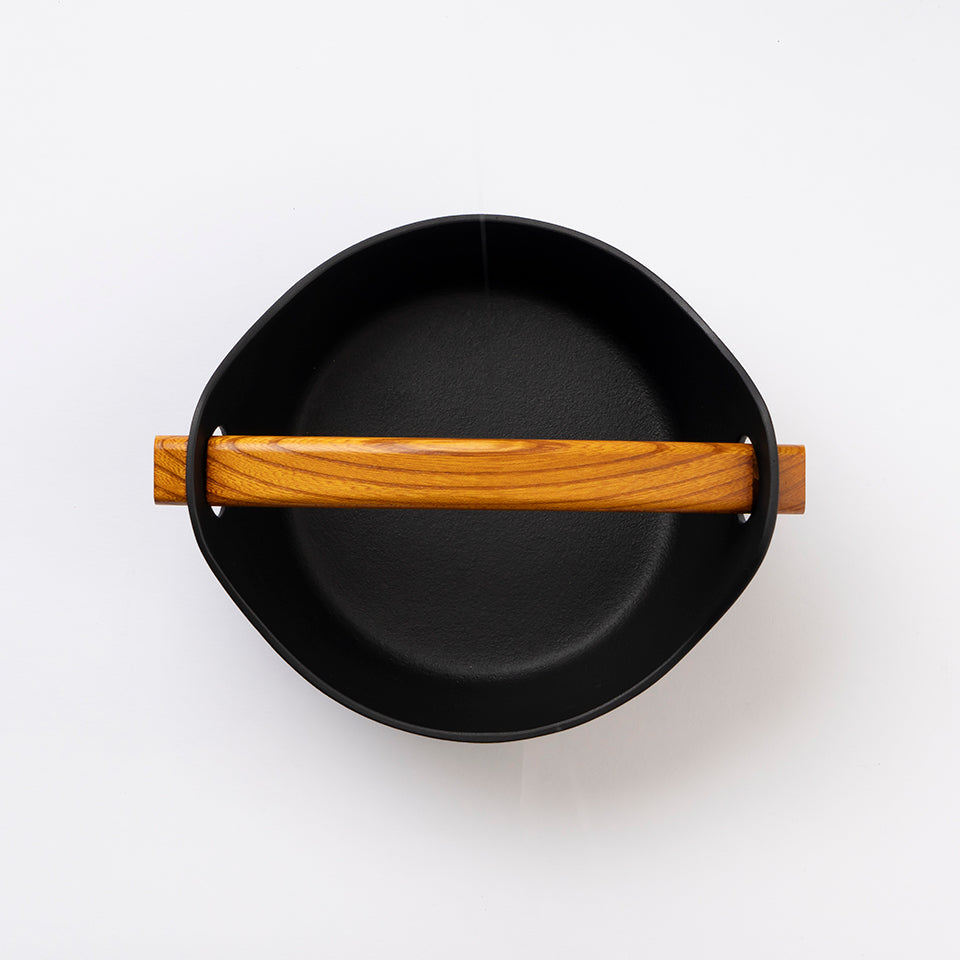 蓋もなく、取っ手は木の棒だけ。焼く、煮る、揚げる、オーブン対応と、ひとつで何役もこなす。調理後、そのまま食卓に出しても。