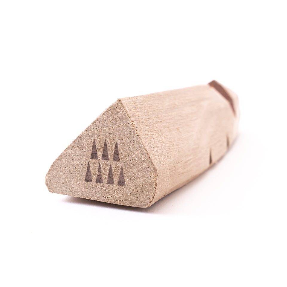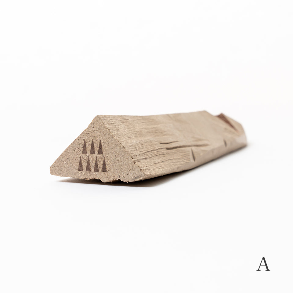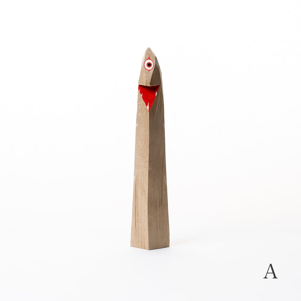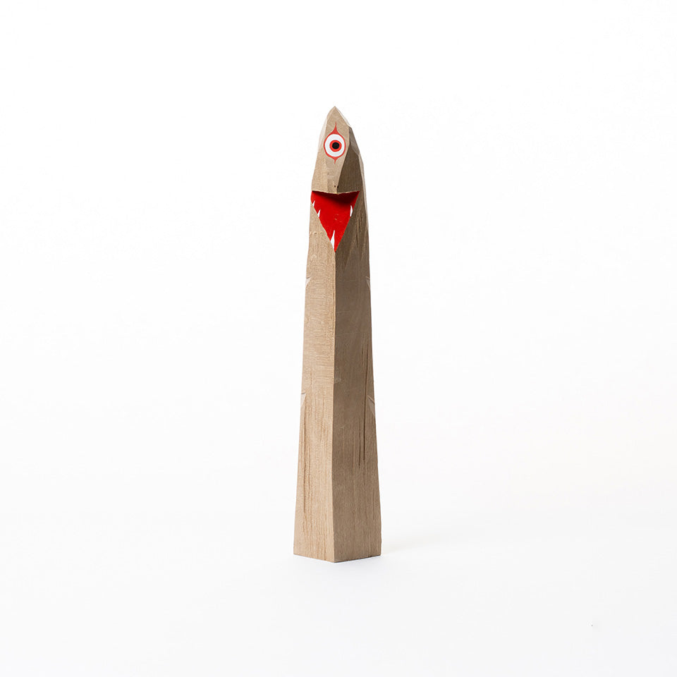 「木を割ったときの荒々しい木肌や木目を残し、木材のねじれや多少の割れや節も生かしています。素材感が伝わるよう絵付けもシンプルに。怖いものをつくったつもりなのですが、”かわいい”、“おもしろい”と言ってもらえて、うれしい驚きでした」