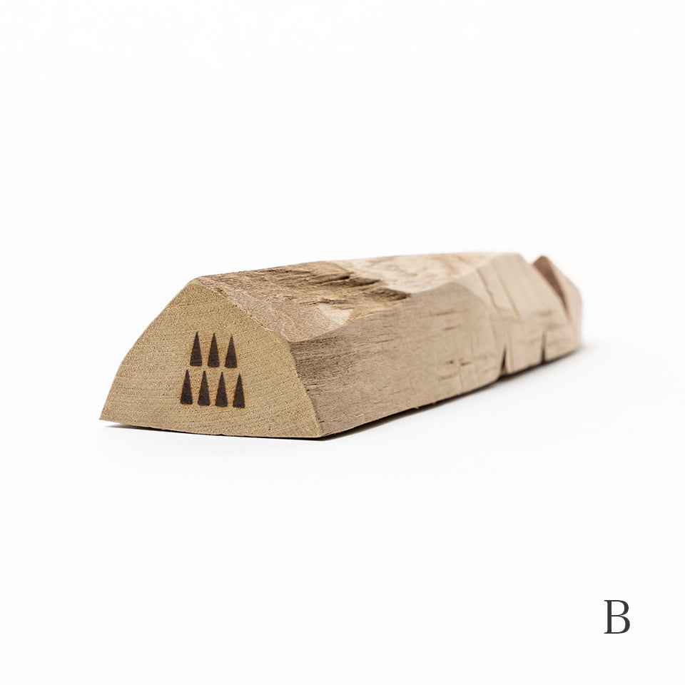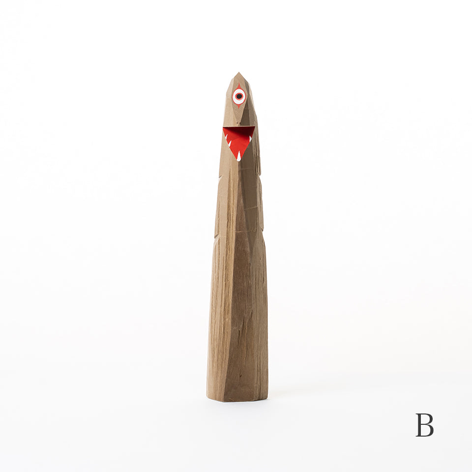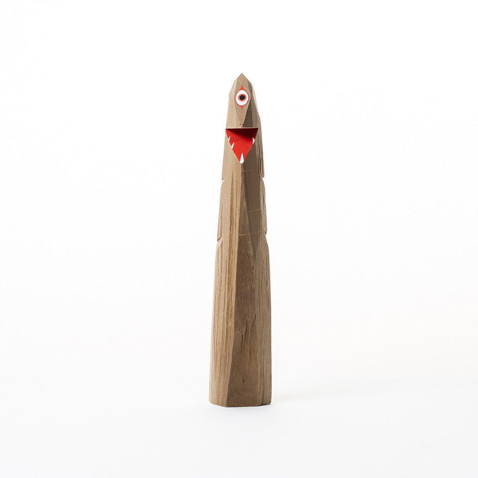 「木を割ったときの荒々しい木肌や木目を残し、木材のねじれや多少の割れや節も生かしています。素材感が伝わるよう絵付けもシンプルに。怖いものをつくったつもりなのですが、”かわいい”、“おもしろい”と言ってもらえて、うれしい驚きでした」