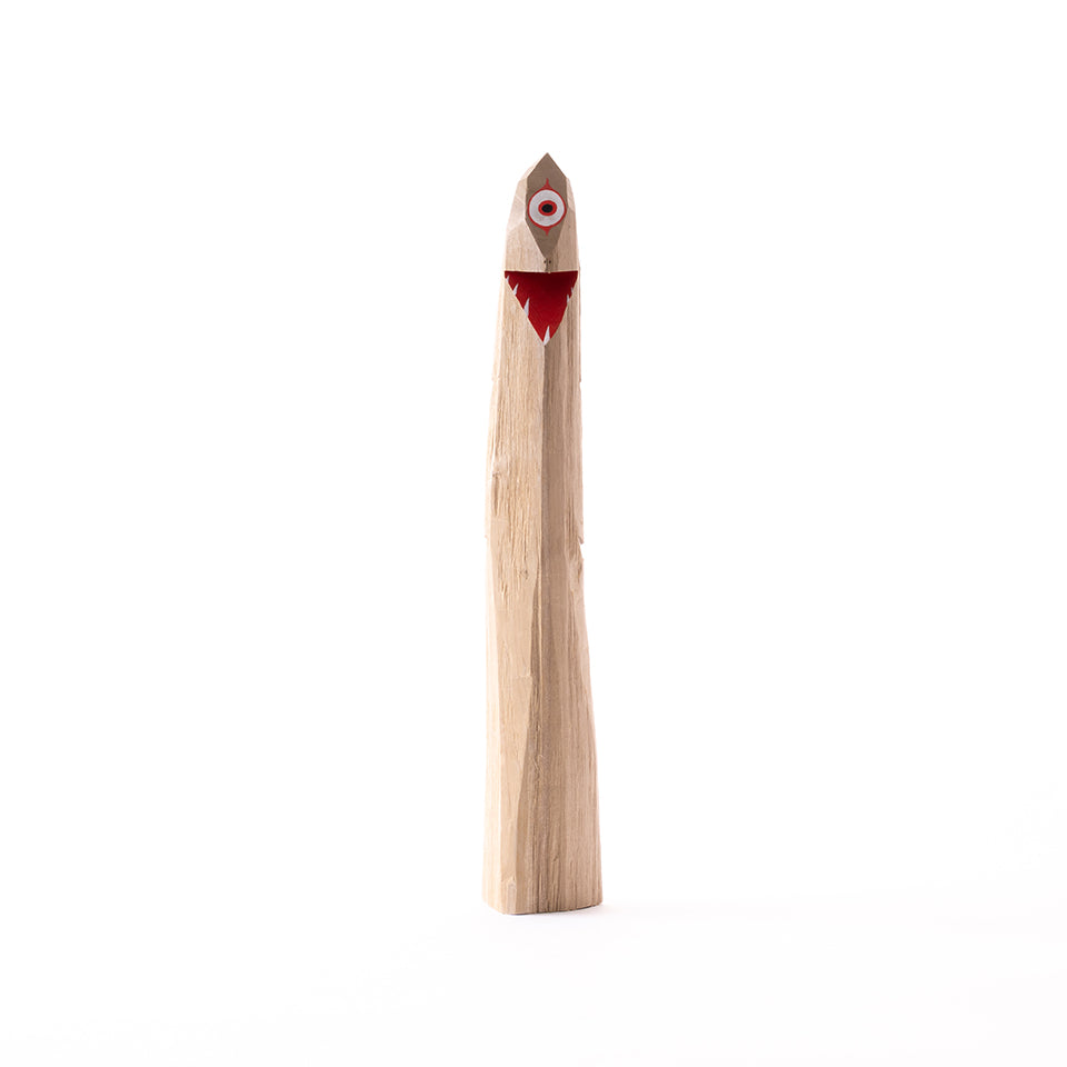 「木を割ったときの荒々しい木肌や木目を残し、木材のねじれや多少の割れや節も生かしています。素材感が伝わるよう絵付けもシンプルに。怖いものをつくったつもりなのですが、”かわいい”、“おもしろい”と言ってもらえて、うれしい驚きでした」