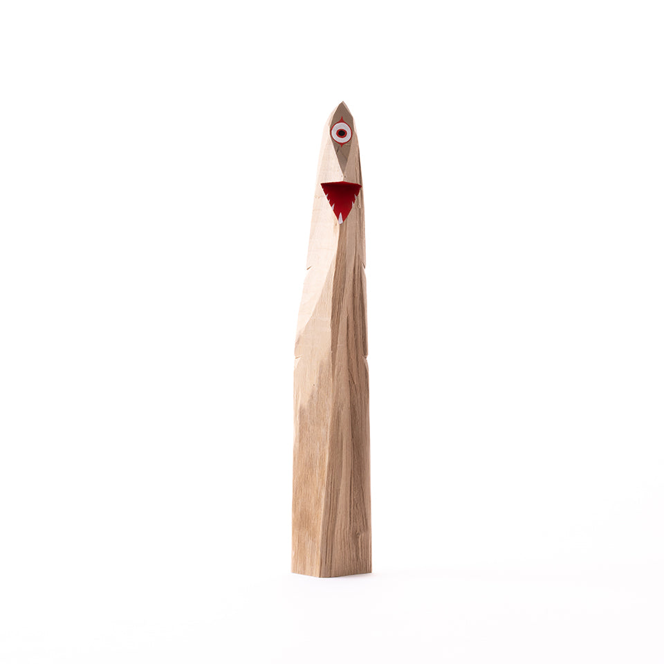 「木を割ったときの荒々しい木肌や木目を残し、木材のねじれや多少の割れや節も生かしています。素材感が伝わるよう絵付けもシンプルに。怖いものをつくったつもりなのですが、”かわいい”、“おもしろい”と言ってもらえて、うれしい驚きでした」