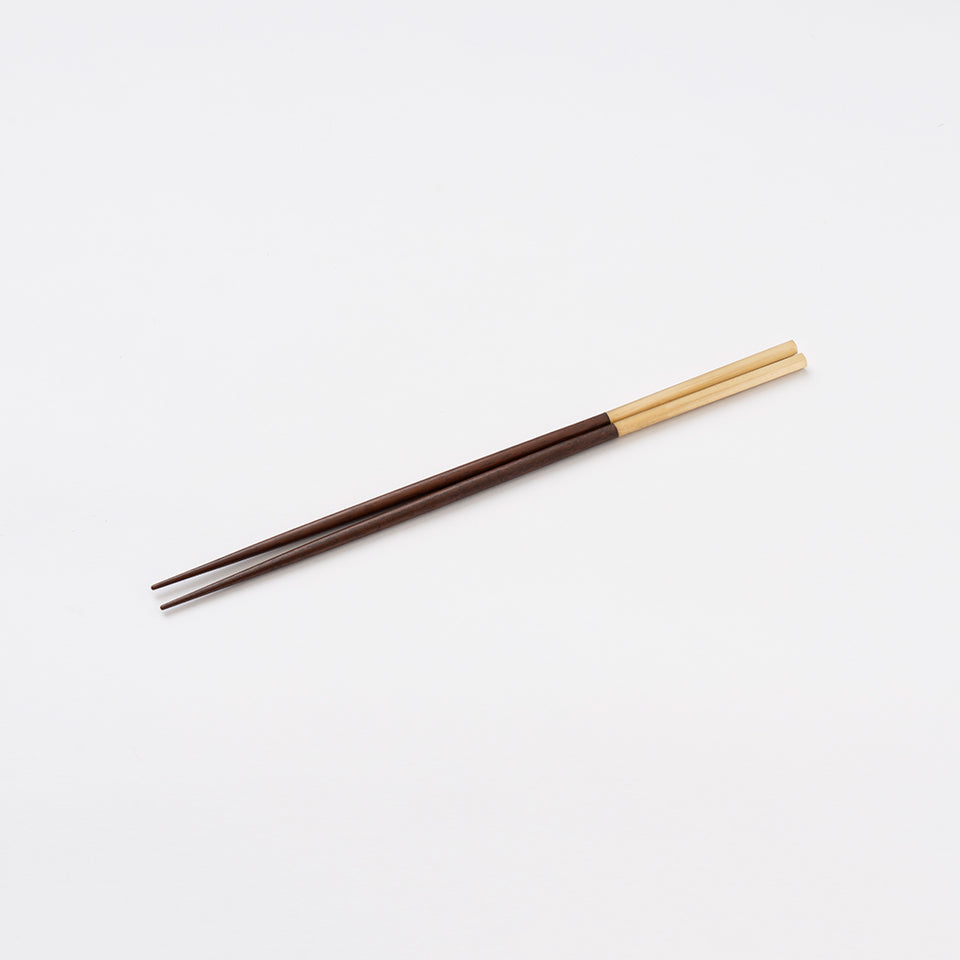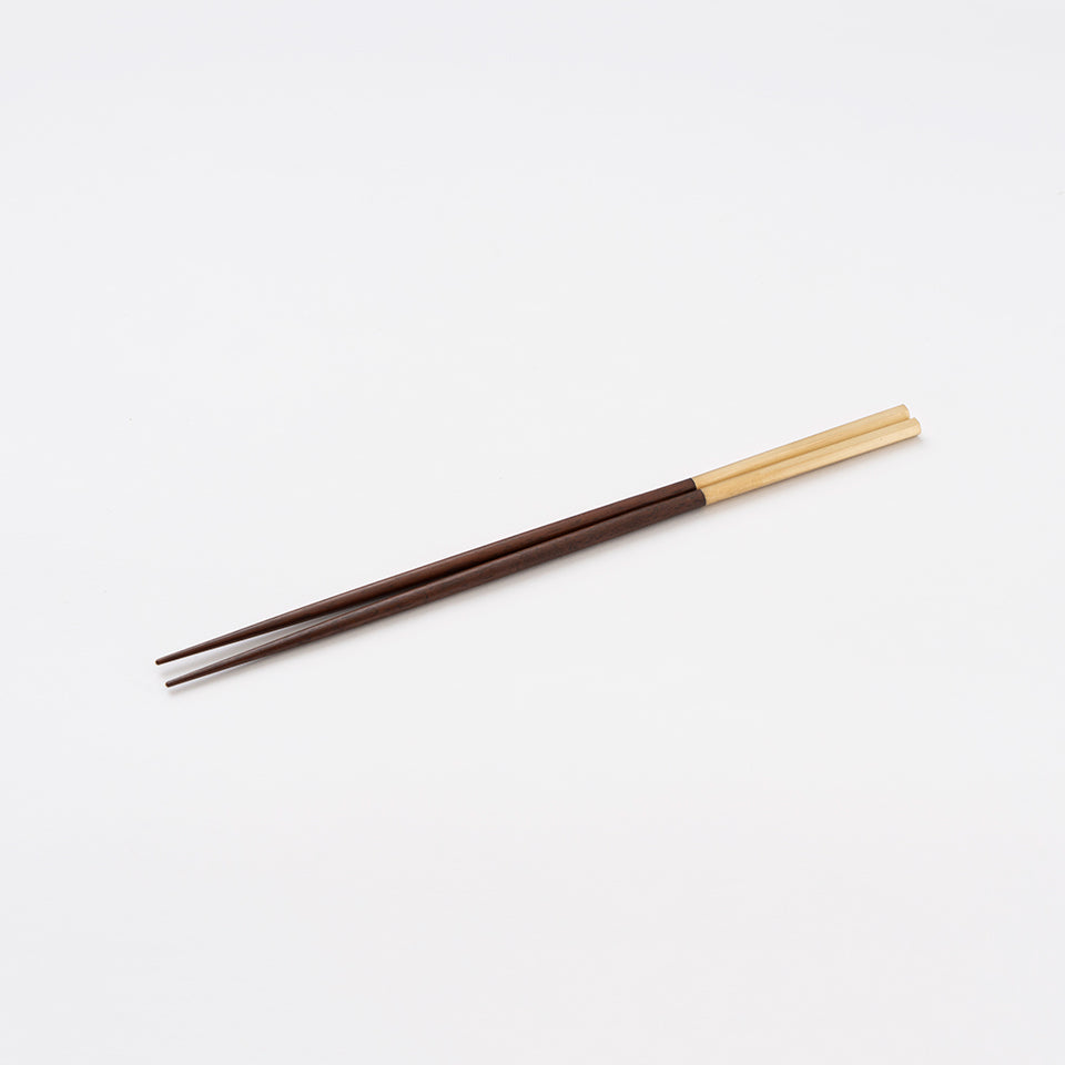 こちらは、木と真鍮を組み合わせた箸。持ち手部分に重みがあるため動かしやすく、安定感もある。木部は木目の美しさが際立つ拭き漆仕上げ。