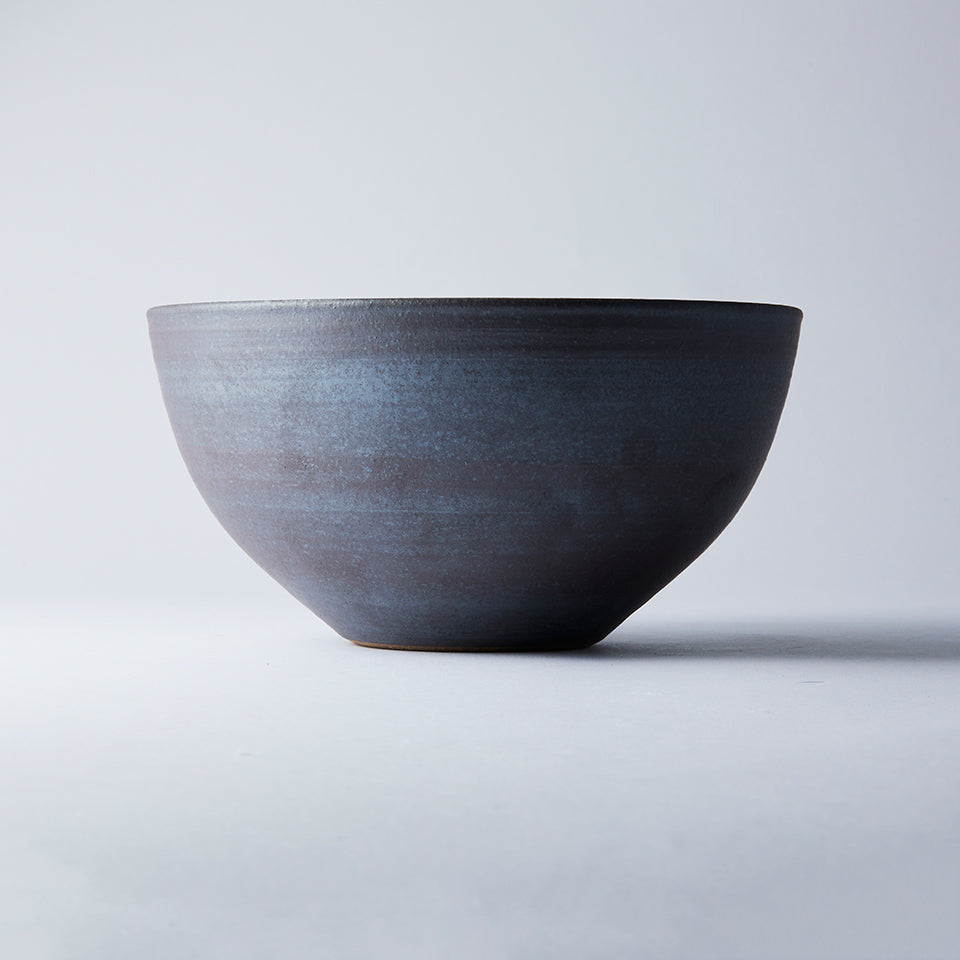 こちらの「丸深鉢(ボウル) 6寸 外鉄内呉須」は、30~40年前にお客から依頼を受け、製作されたボウル。外側の鉄砂釉(黒)と内側の呉須釉(青)のコントラストが斬新。メインのうつわとして、または丼鉢としても重宝する。