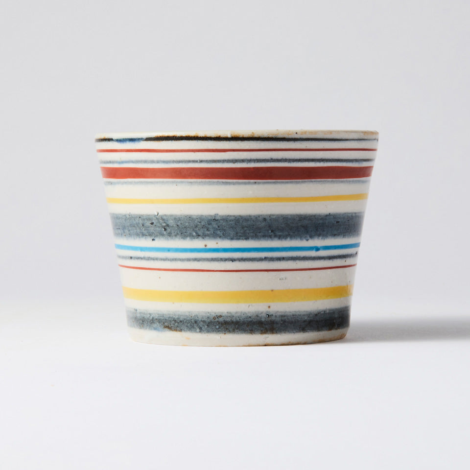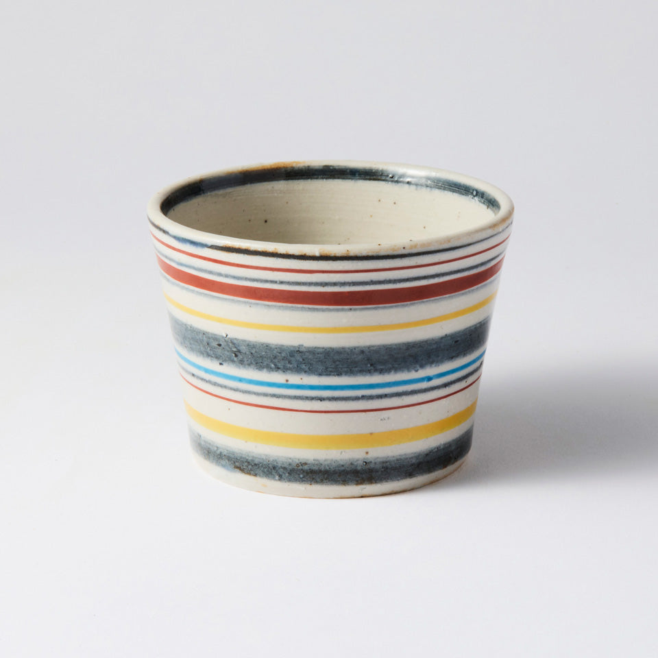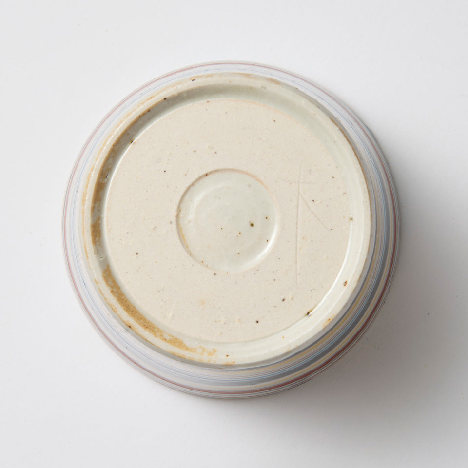 こちらは「灰釉絵付蕎麦猪口」。釉薬を極力薄く施すことで生まれる緋色の微妙な表情が、染付けの呉須に加え、赤・青・黄の絵付けの色彩をいっそう際立たせる。