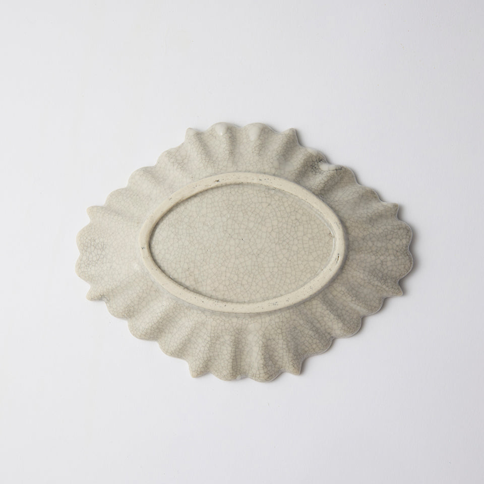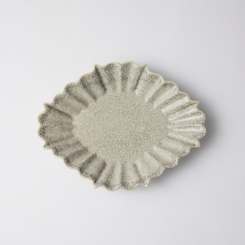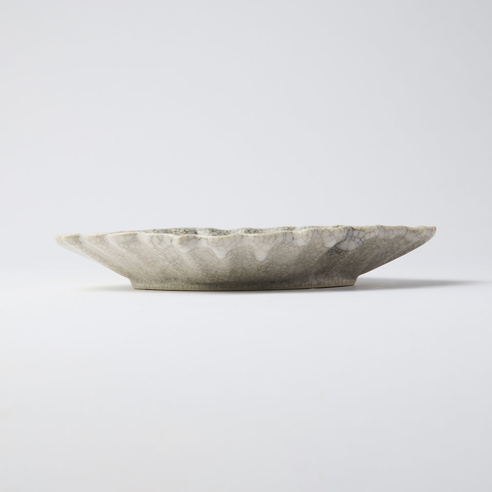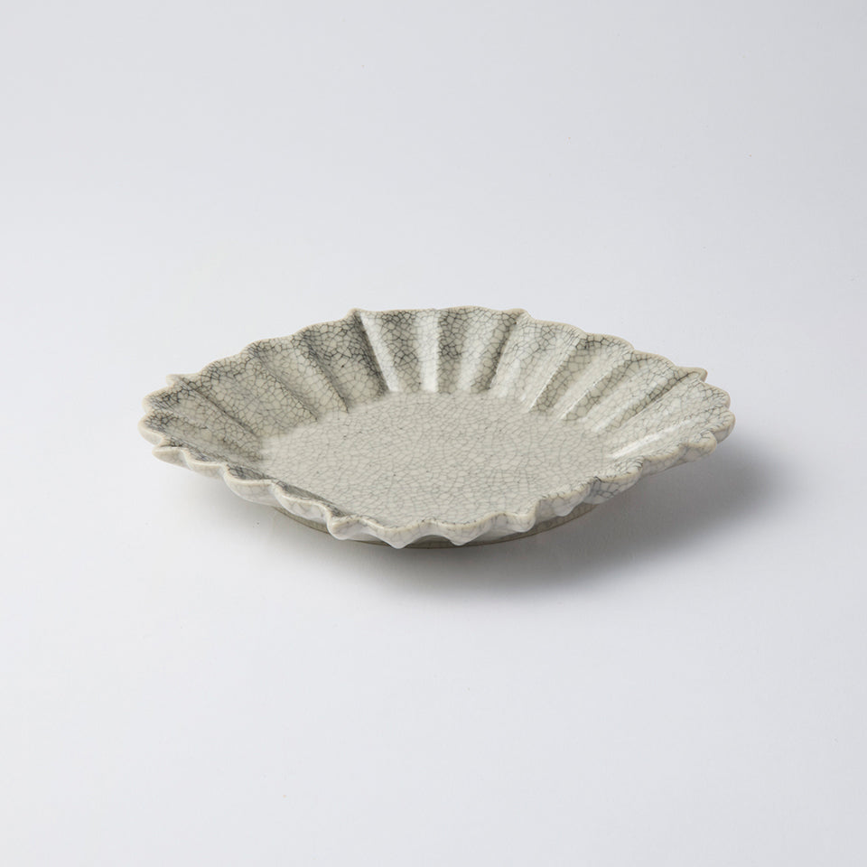 表面に広がるヒビ模様は、焼成後、墨汁の中にうつわを漬け込み、貫入に墨を染み込ませてつくり上げる。「墨貫入」と呼ばれる技法で、使うほどに味わいが増していく。縁に施したプリーツが愛らしく、向付としての利用はもちろん、普段の食事の取り皿やケーキ皿としても重宝する。