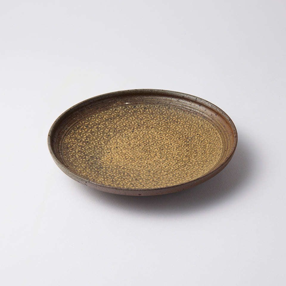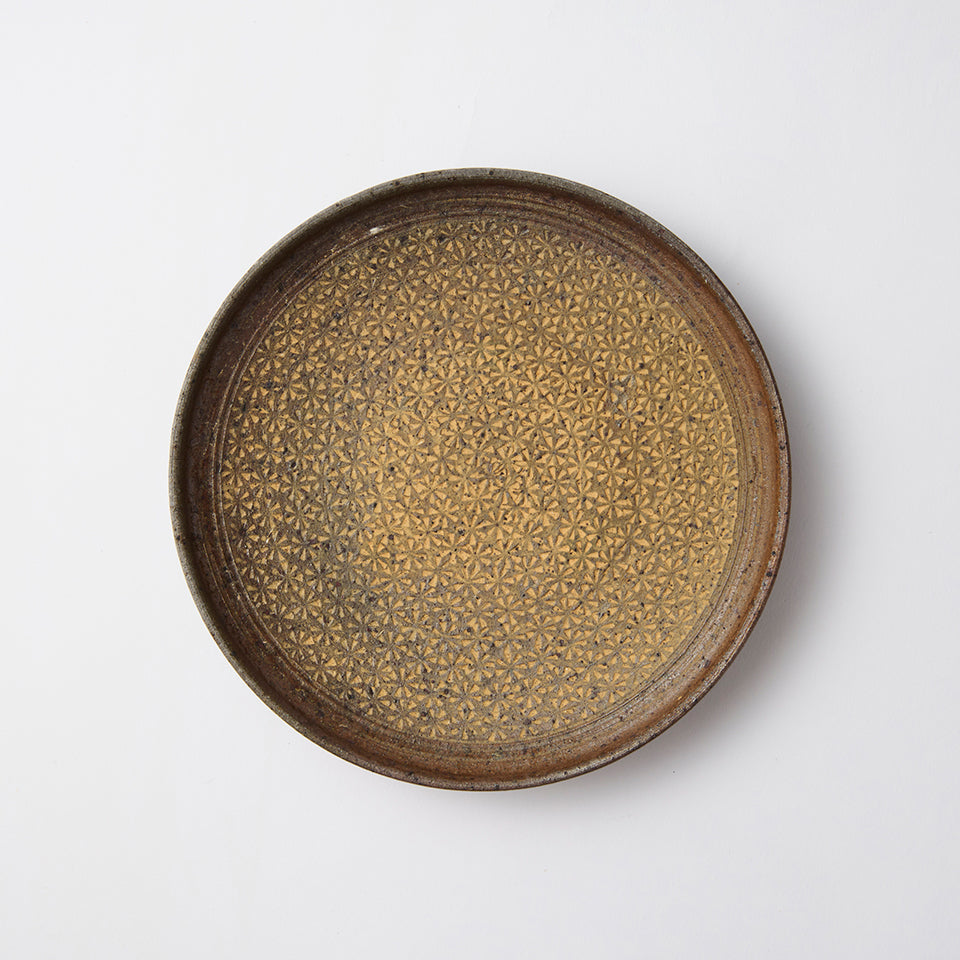 井銅心平さんの代表作のひとつが象嵌。うつわの表面に印を押し、そこに色の異なる泥を埋めて装飾する技法だ。「私の場合、象嵌は装飾というよりも、表情の一部として施しています。焼成時に模様が消えてもいいと思っていて、むしろうつわに自然と溶け込むことを目指しています」(井銅さん)