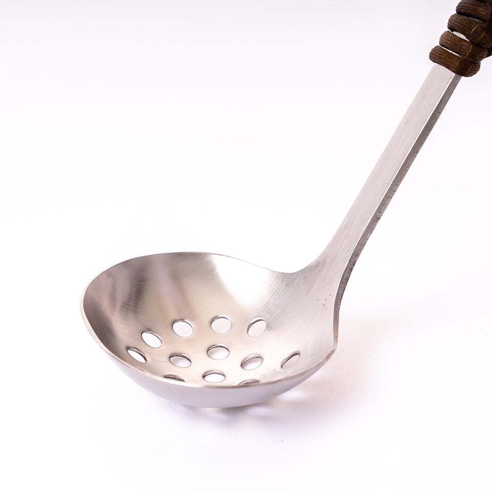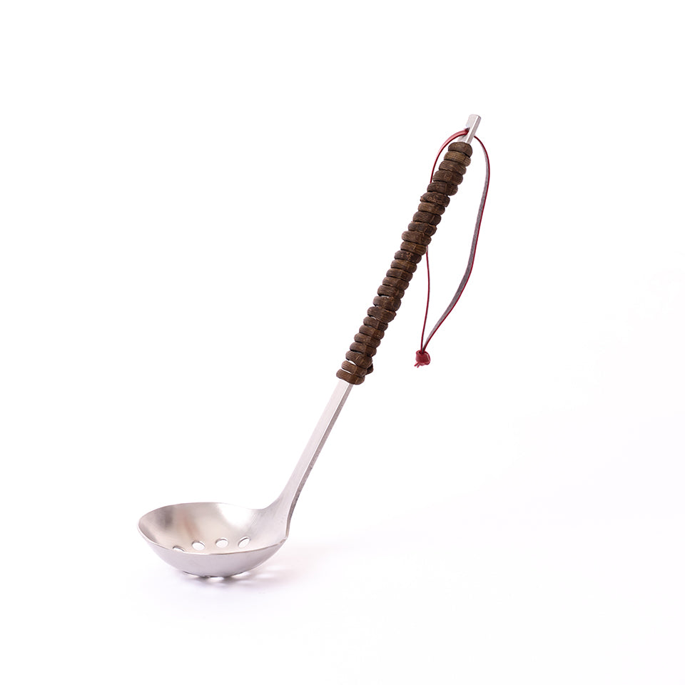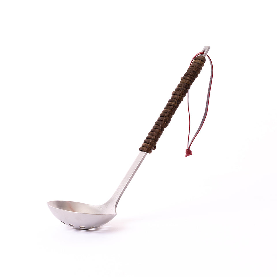 「パセリ 穴明お玉 小 アケビ巻」は、卵を流し入れる、味噌を溶くなど、多彩な料理で重宝する名脇役。継ぎ目がないので、洗いやすく衛生的。サイズ違いの「パセリ 穴明お玉 大 アケビ巻 [9]」のお求めはこちらから。