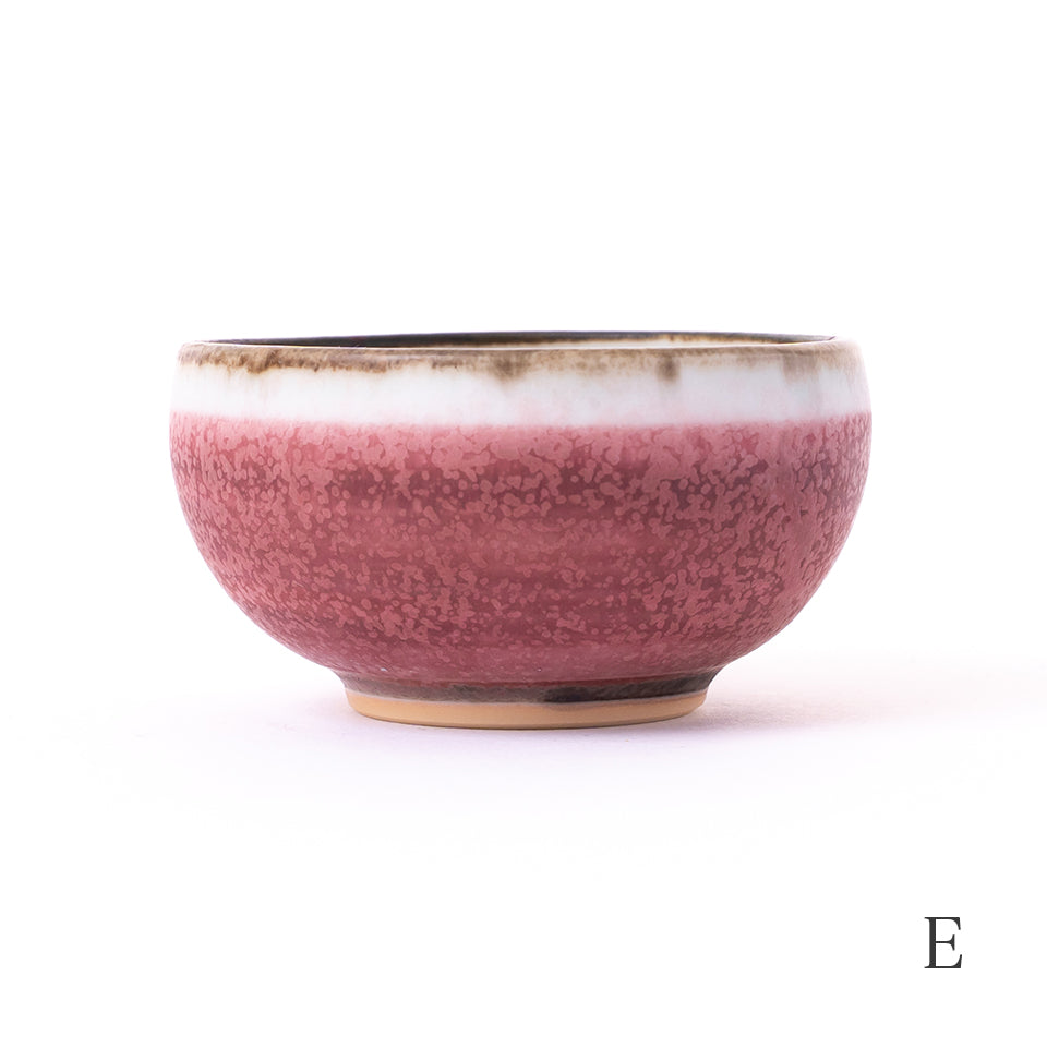 透明感のある磁器に、光と交わるようなゆらぎのある絵付けが施された「色のうつわ」。15年ほど前からつくりはじめたシリーズである。その原点は、釉薬に凝っていた学生時代にたまたまきれいに赤の発色ができたことだと田中さん。銅で赤を発色させる釉裏紅ゆうりこうという技巧だが、従来の血のような色合いではなく、明るく透明感のある赤だ。