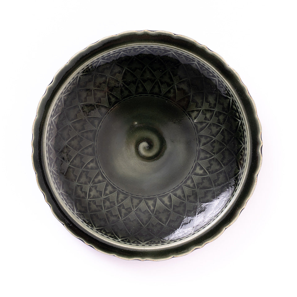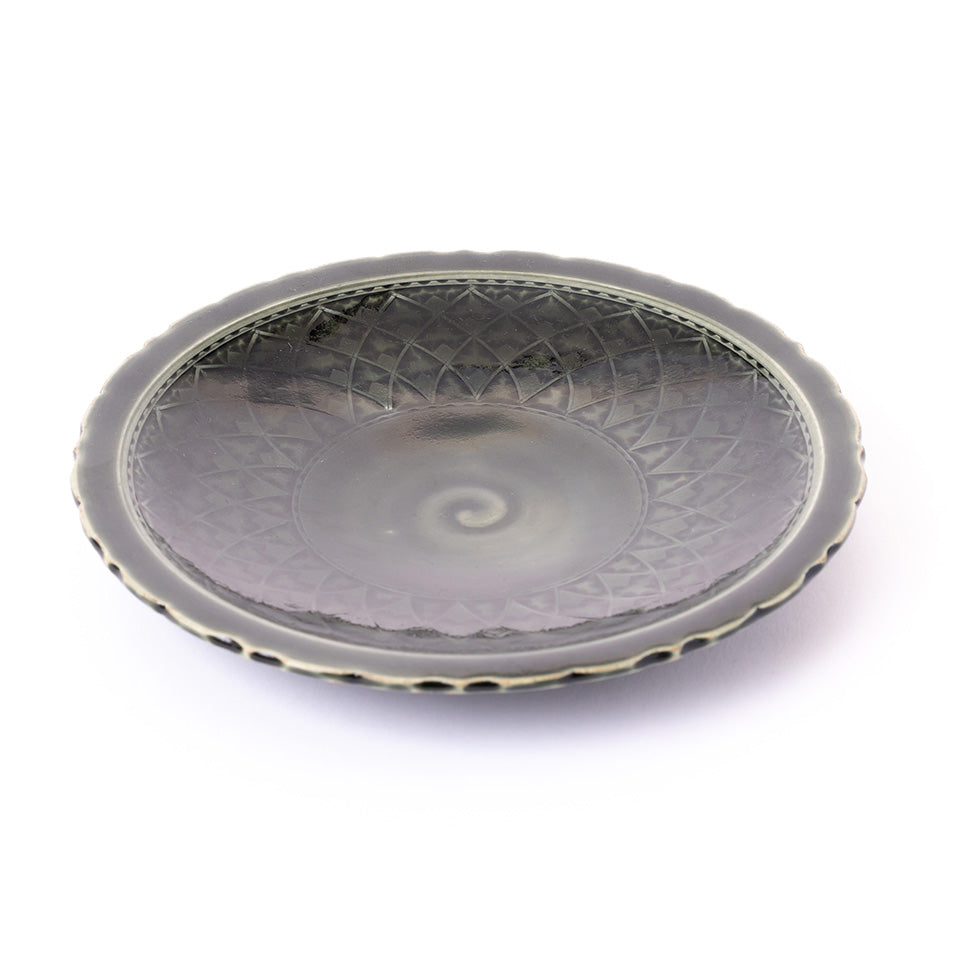 繊細な彫りの技術を駆使し、装飾による表情豊かなうつわに定評がある増渕さん。褐釉や青釉による色のうつわをつくりはじめた当初、彫り込みは現在より深い1~2㎜だったものを、ずっと浅い0.1~0.2㎜にし、水の中から浮かび上がるような透明感と立体感を追求した。