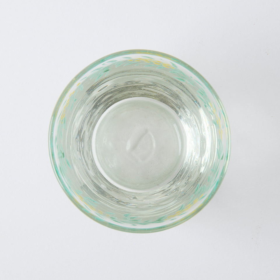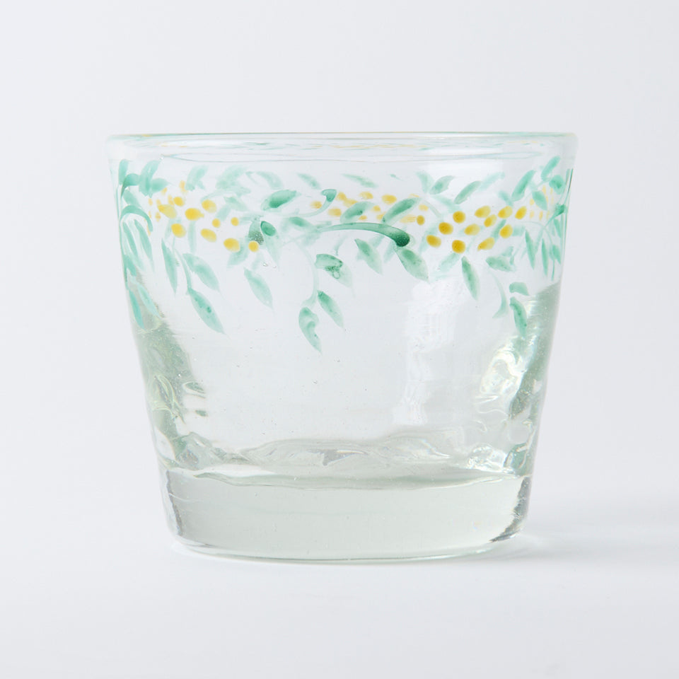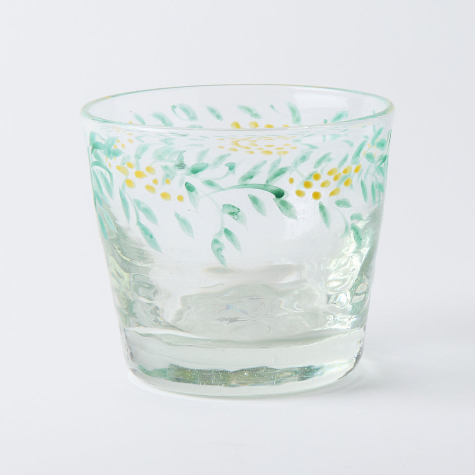 こちらは「ミモザ文コラボカップ」。ガラス作家・前嶋洋明さんとのコラボ作品。絵付けのため前嶋さんの工房に出向く途中で、たまたま目にしたミモザを描いたもの。