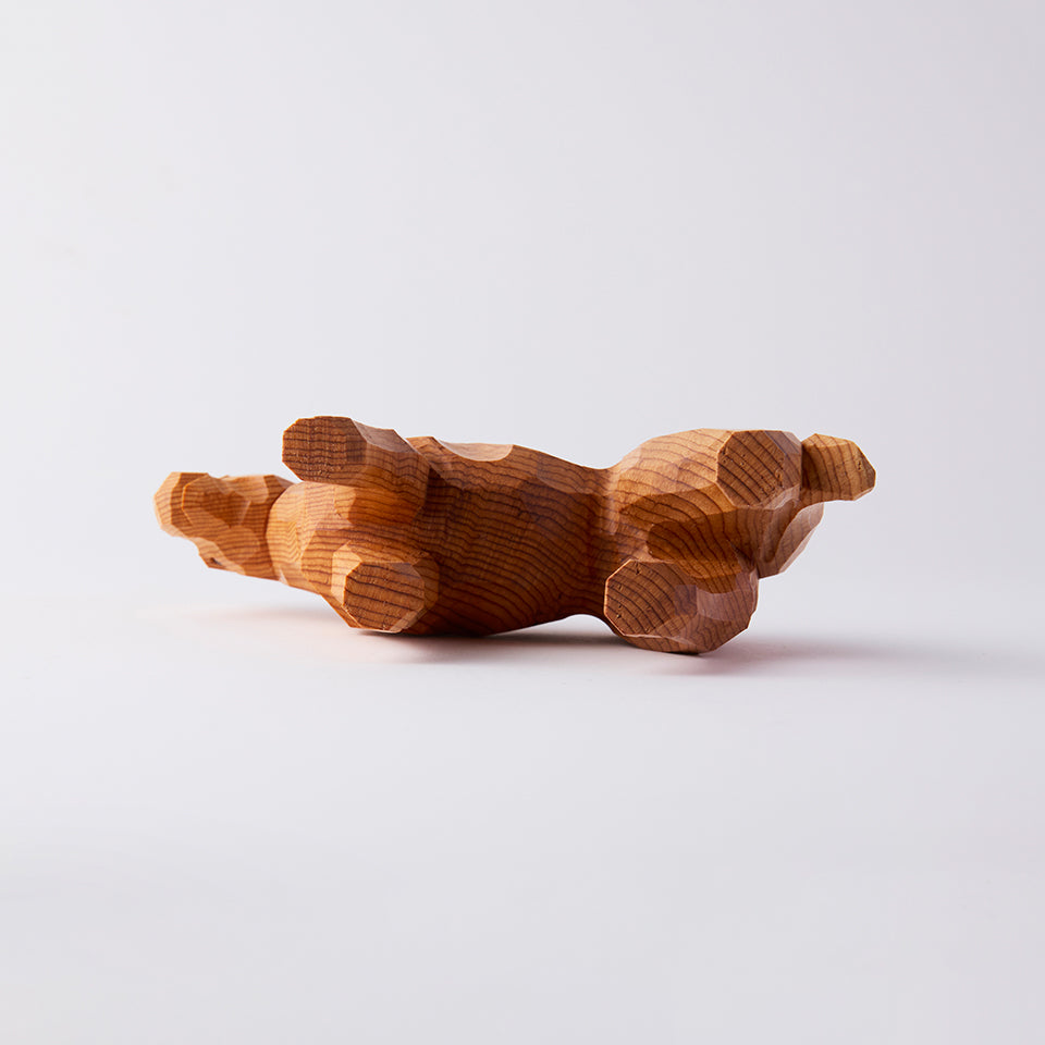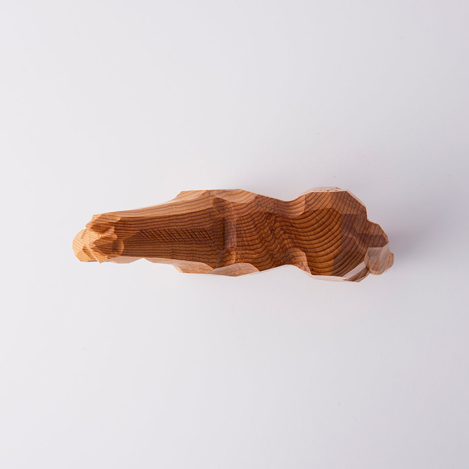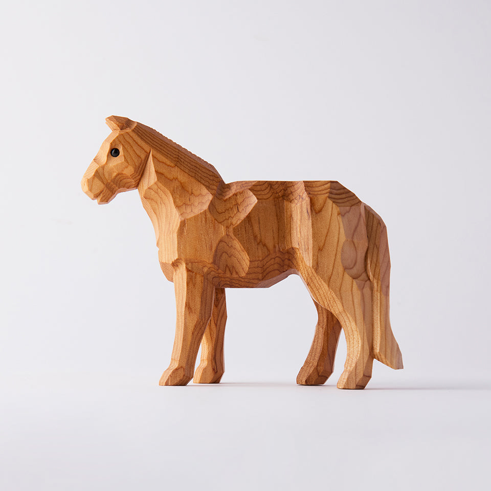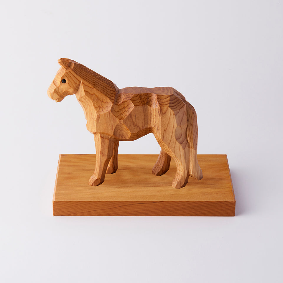 こちらは一位一刀彫 鷲塚彫刻による「午」。馬がもつしなやかで力強い筋肉を、銘木・イチイの美しい木目を生かして造形。細く長い脚は、繊細なタッチで彫りが施されている。