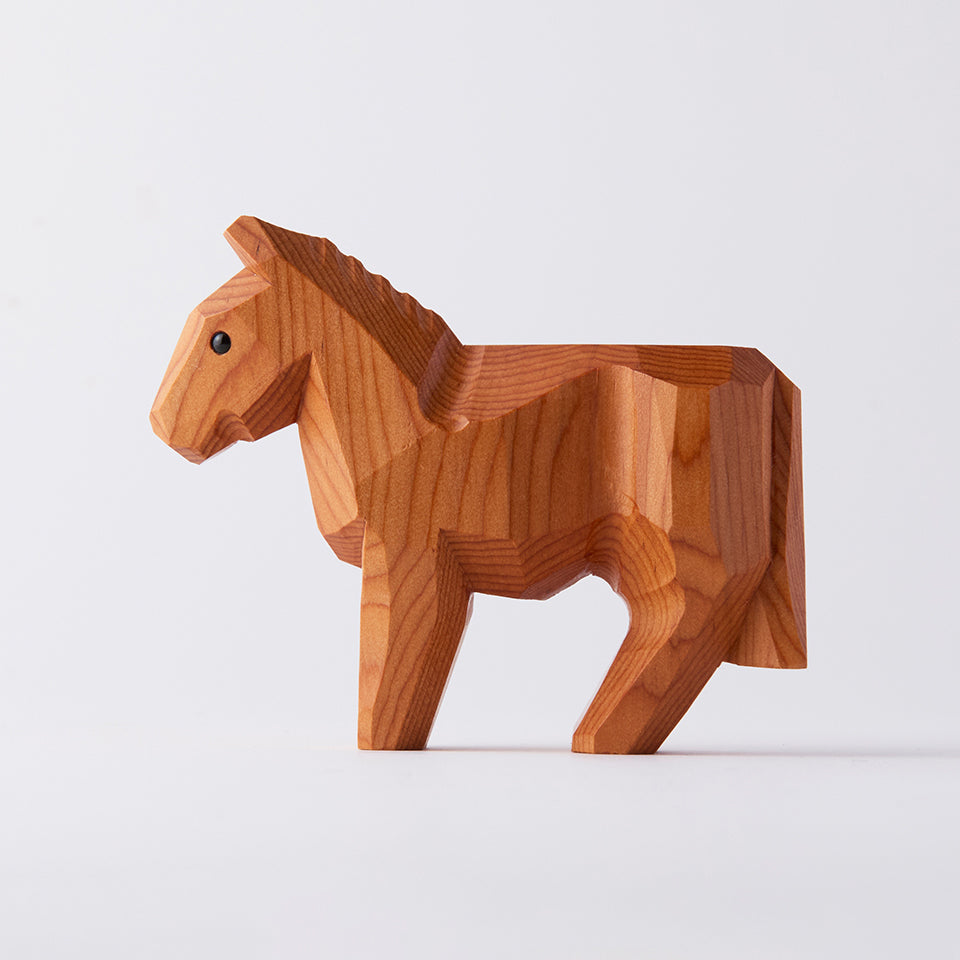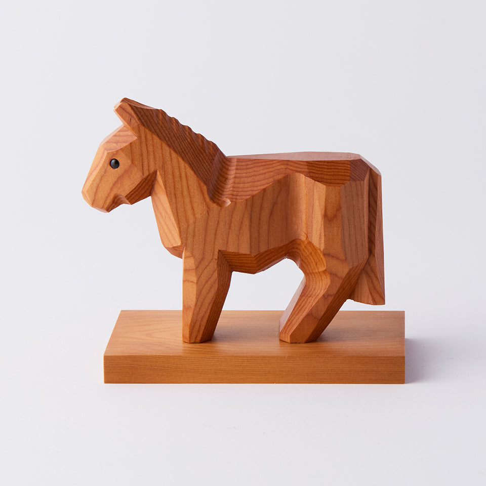こちらは一位一刀彫 鷲塚彫刻による「午(小)」。穏やかな暮らしを願ってつくられた干支シリーズ。つぶらな瞳で見つめる手のひらサイズの置物は、毎年集めたくなるほど愛らしい。