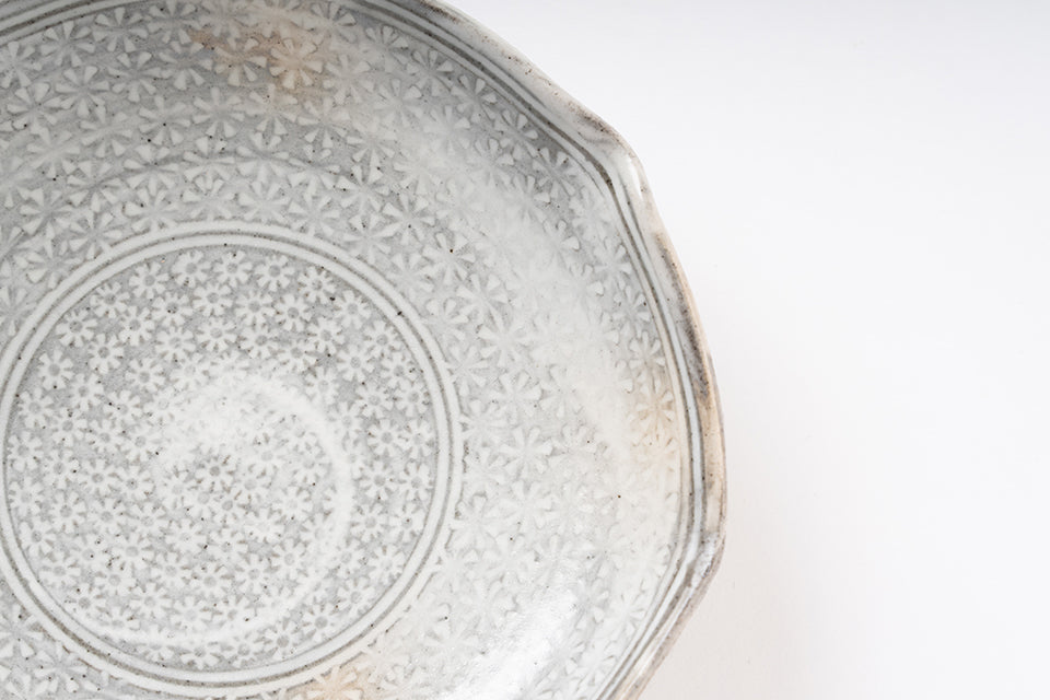 井銅心平さんの代表作のひとつが象嵌。うつわの表面に印を押し、そこに色の異なる泥を埋めて装飾する技法だ。「私の場合、象嵌は装飾というよりも、表情の一部として施しています。焼成時に模様が消えてもいいと思っていて、むしろうつわに自然と溶け込むことを目指しています」(井銅さん)