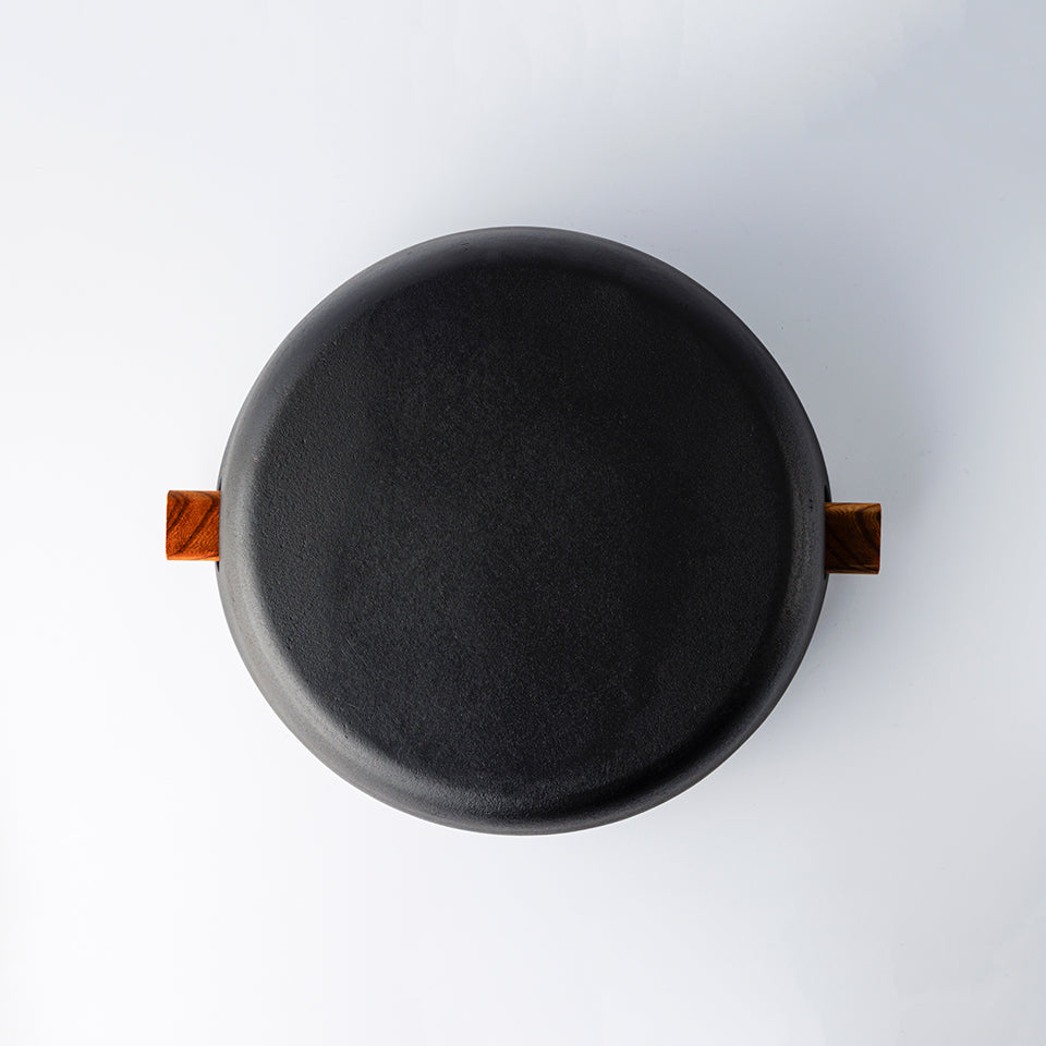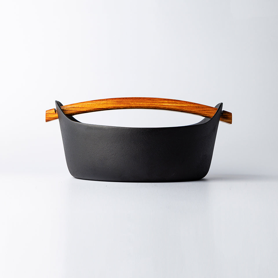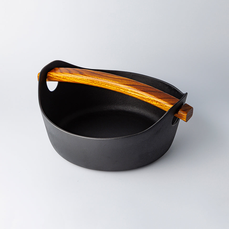 こちらの「洋鍋(大)」は、2人以上、もしくは大人数のもてなし料理にも重宝するサイズ。蓋もなく、取っ手は木の棒だけ。焼く、煮る、揚げる、オーブン対応と、ひとつで何役もこなす。調理後、そのまま食卓に出しても。
