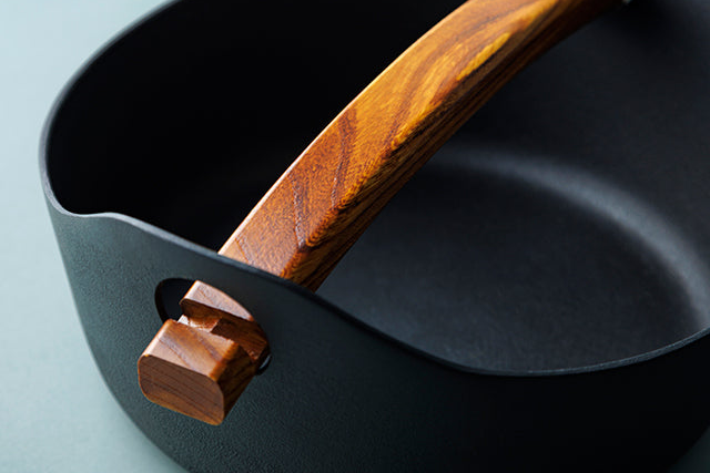 無駄を省いたシンプルな鍋は、木製の持ち手がアクセント。黒と茶のコントラストがモダンな印象だ。熱伝導率が高く保温性にも優れているため、煮込み料理に最適。ステーキや野菜ソテーもジューシーに仕上がる。持ち手をスッと外せばうつわとしても機能。調理後、そのままテーブルに置いても絵になる。同時期に誕生したワンハンドパンやシャロウパンは、縁の高さや持ち手の長さが絶妙で、細部までこだわり抜いている。