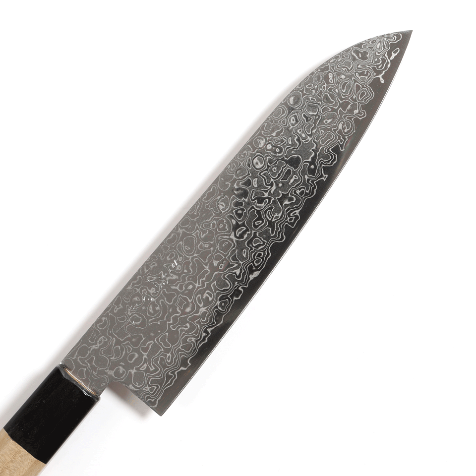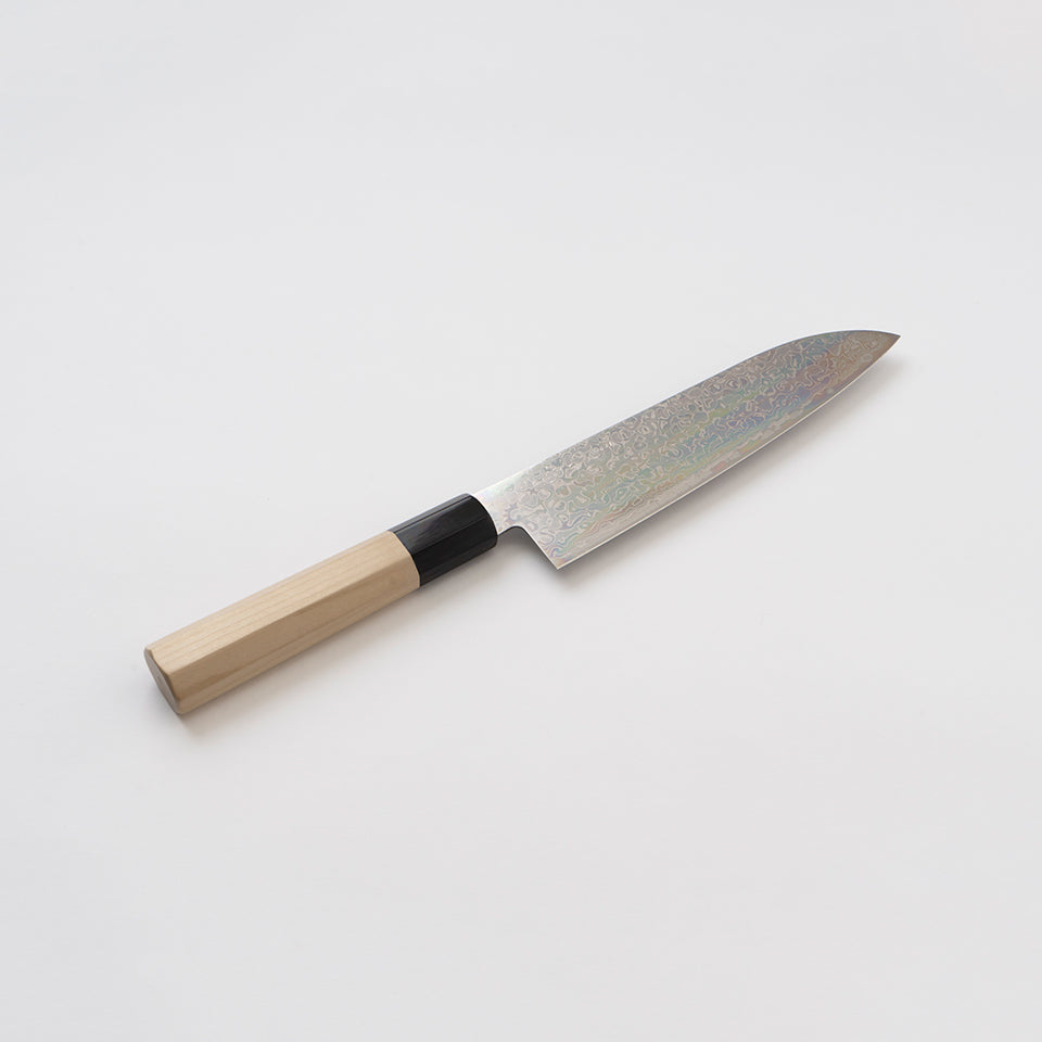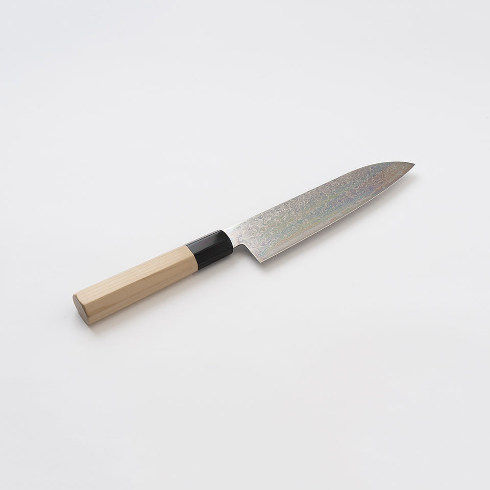 こちらは文様が美しい積層鍛地シリーズの「和三徳」。ブレードは極限まで薄く研ぎ上げて切れ味に持続性を持たせる仕上がりに。ハンドルは和包丁を代表する水牛八角柄で握りやすさとバランスを両立している。
