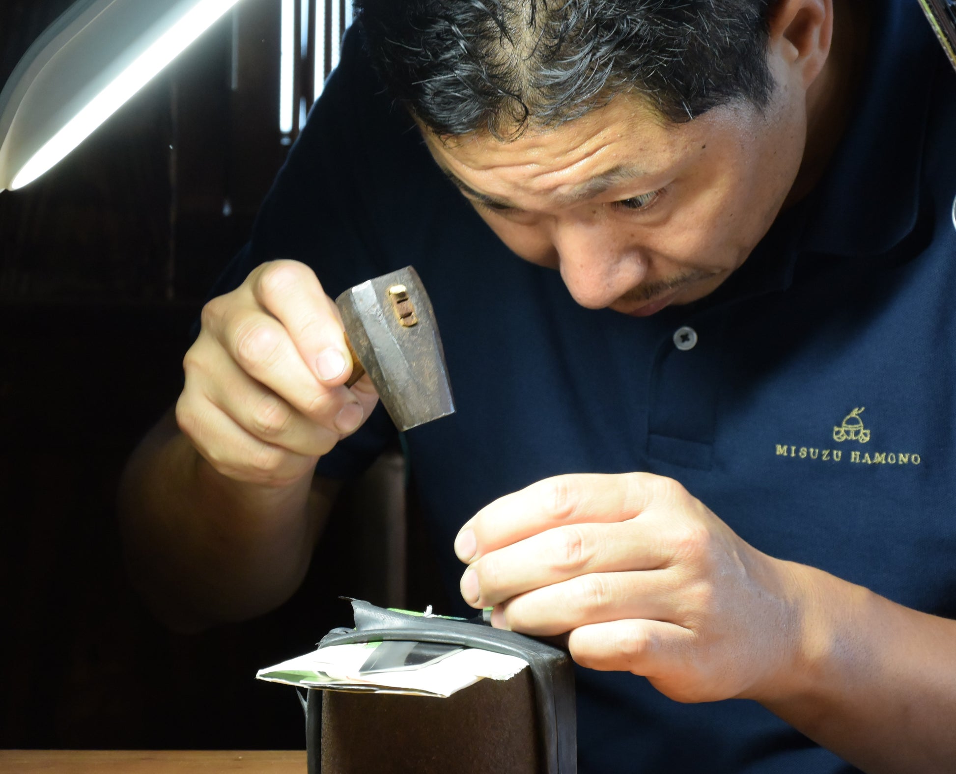戦後、初代・鈴木信次さんが染め物業から刃物業へと転業。ステンレスで鋼を挟み込んだ鋼材を用いた日本初のステンレス割込包丁を製造。2代目・鈴木明さんが事業を継承後、現在3代目・宮脇大和さんが包丁づくりに励む。